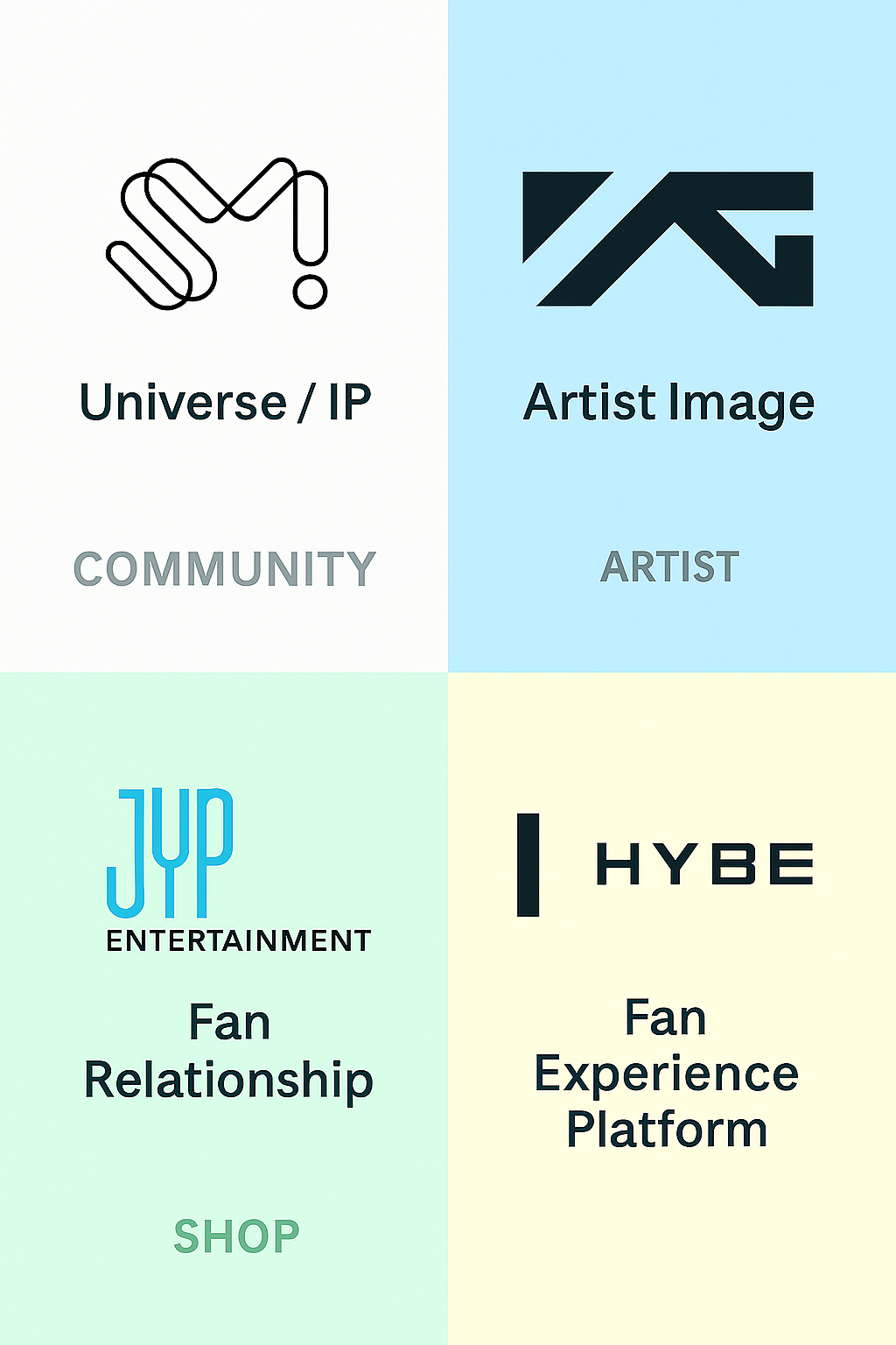 | JYP | 팬과의 유대감, 인간적 친밀감 중심 | 팬-아티스트 간의 관계성 |